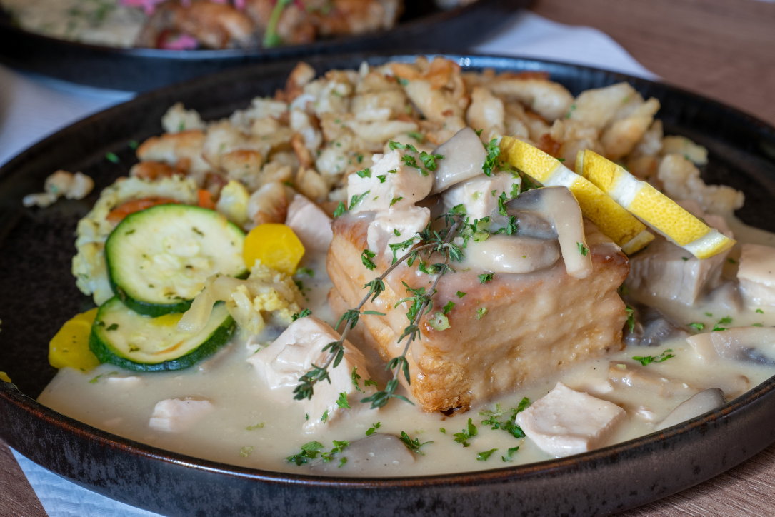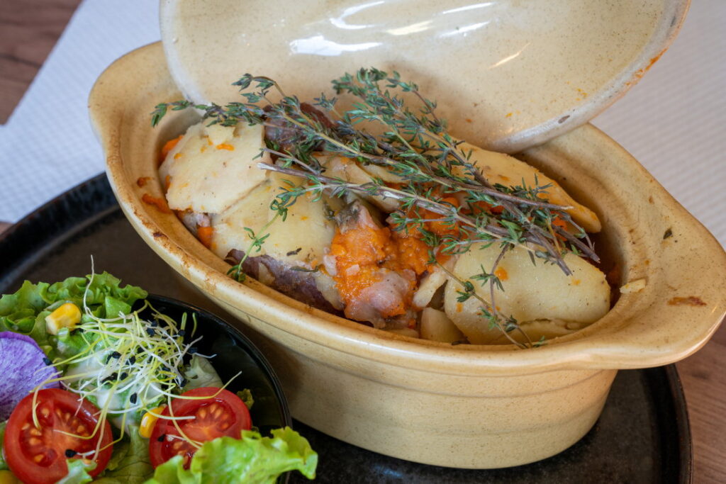 Während wir uns unterhalten, beginnt ein regelrechter Ansturm an Gästen. Fast so, als gäbe es nirgendwo anders etwas zu essen. Im Nu sind Restaurant und Nebenzimmer voll besetzt. Loïc Garcia verschwindet in der Küche und zeigt, was er so draufhat. Ich freue mich aufs heutige Menü: Lauchtarte mit Salat als Vorspeise – eine Riesenportion, die mir sehr gut schmeckt. Danach gibt’s Königinpastete mit selbst geschabten Spätzle. Die Präsentation und der Geschmack überzeugen mich restlos, und mir ist klar, dass ich bald wiederkommen werde.