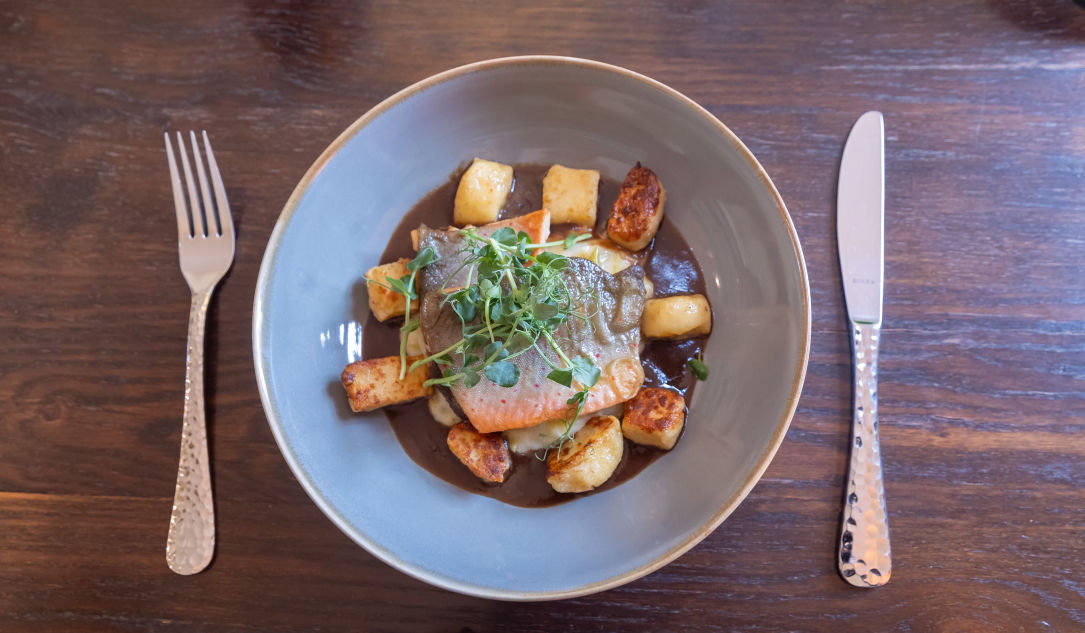 Wir essen natürlich auch bei unserem Besuch regional. Erst gibt es eine schmackhafte Terrine der Délisoeurs aus Homburg, Saibling von Marc Rosengarten und dann ein Steak vom Rind von Wolfgang Maffert. Und zum Abschluss eine Dessertvariation. Alles schmeckt wirklich richtig gut. Neu ist hier übrigens auch, dass sie neben Bier von Karlsberg auch Tiny Brew Helles im Angebot haben – Bier einer kleinen Brauerei aus dem Bliesgau. Die Weinkarte bietet in unterschiedlichen Preissegmenten regionale und internationale Weine an. Jeder nach seinem Gusto! Auch die „kleinen“ Weine von Dirk Mast überzeugen. Und wer gar keinen Plan hat: Die Weine von Petgen-Dahm aus dem saarländischen Perl-Sehndorf schmecken immer!