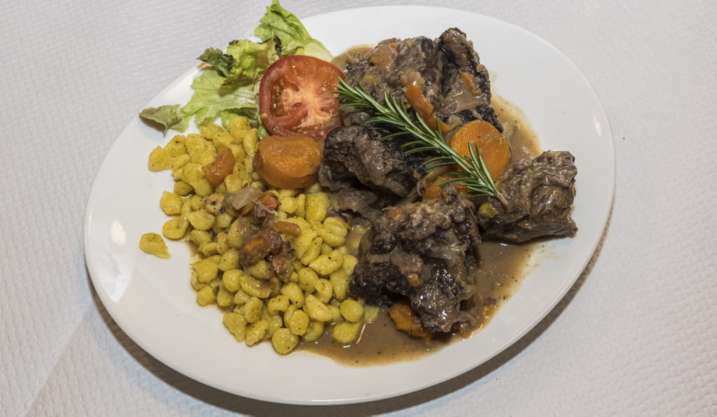 Andere Gäste bestellen gern „Crevettes roses“, die ebenfalls sehr gut sind. Bei den Hauptgängen orientieren sich viele am Fleisch der Metzgerei Schwamm. Lammkotellets, Entrecôtes oder Cordon Bleu „Munster“. Da kann man gar nichts falsch machen! Der Flammkuchen hier wird übrigens immer noch nach dem uralten Familienrezept der Familie Woll zubereitet. Ein echter Klassiker und ein Renner dazu.