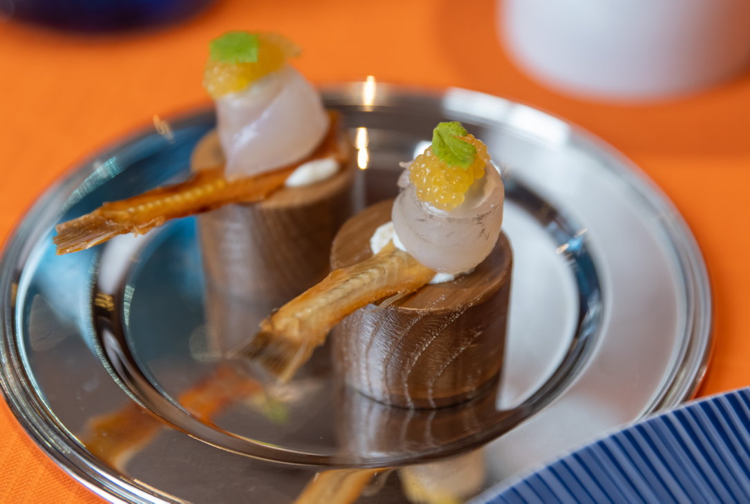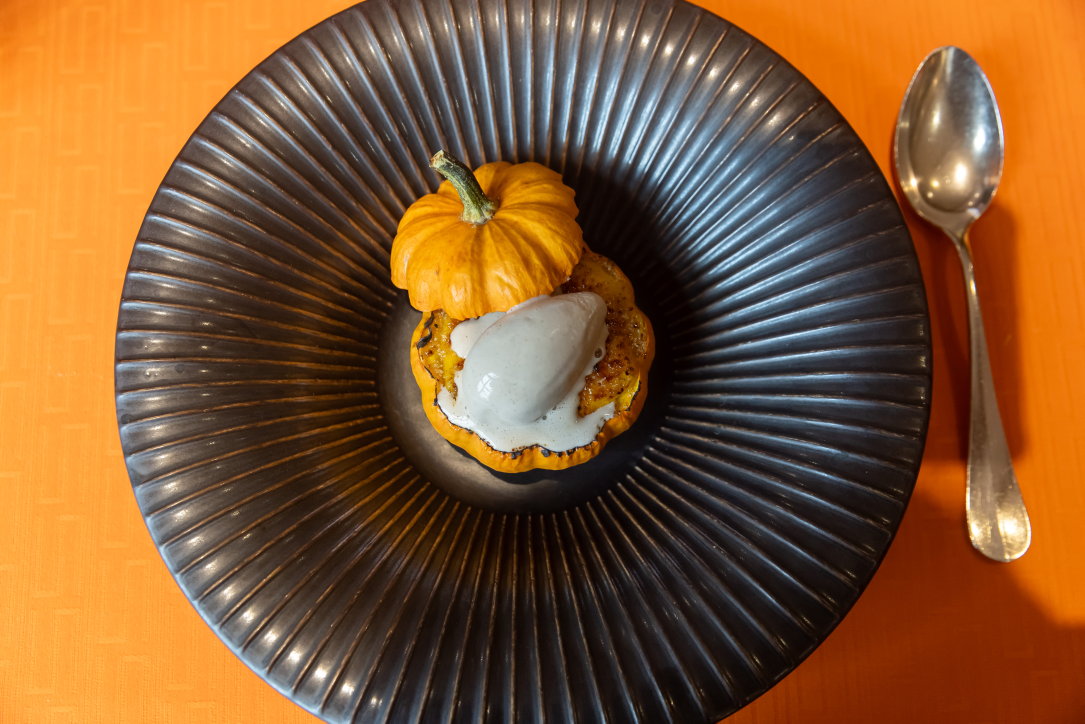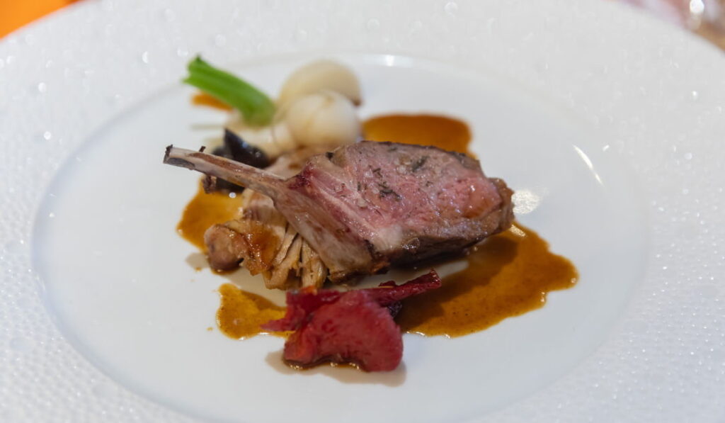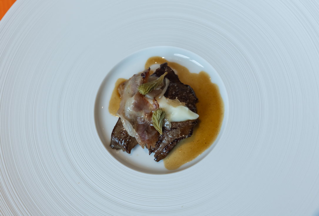 Es folgen Lammbacke und Lammzunge aus dem Bliesgau, mit Kapern, Zitronenkaviar und Kalamata-Oliven. Ich bin wirklich begeistert, als schon der nächste Höhepunkt folgt: Lammherz aus dem Bliesgau mit Petersilienbutter, Paprika und gefüllten Zwiebeln. Und weiter geht es mit Lammleber aus dem Bliesgau, Bauernspeck, Fichtenknospen und einer Melfor-Essig-Reduktion. Sensationell! Danach folgt konfierte Lammschulter aus dem Bliesgau. Zum Probieren legt er mir noch ein Lammkotelett auf den Teller – einfach himmlisch. Zum Abschluss serviert er mir eine Crème Brûlée mit Kürbis Jack be Little. Es ist wirklich ein besonderes Erlebnis, dieses Menü zu goutieren.