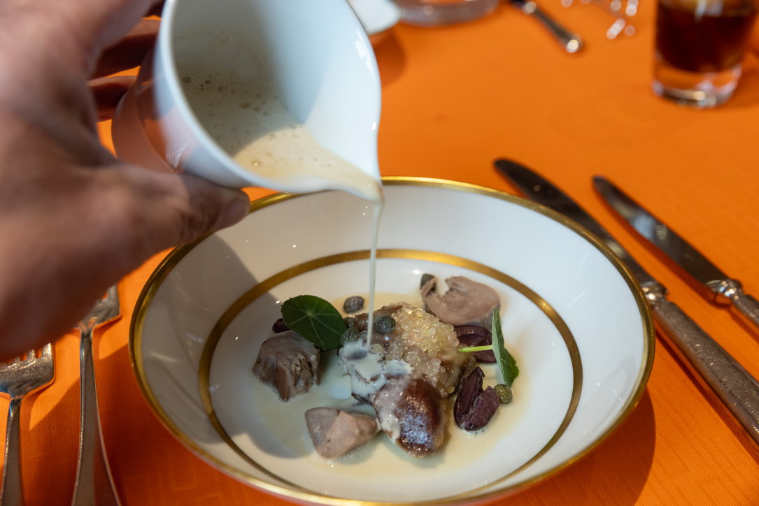 Ich bin wirklich erstaunt und freue mich zugleich riesig auf diese besonderen Kreationen. Stephan Schneider präsentiert mir ein Menü, das überwiegend aus Innereien vom Lamm besteht. Zuerst gibt es aber ein Amuse-Bouche mit Spezialitäten aus der Küche, darunter der Barsch vom Lothringer See. Der erste Gang ist eine perfekte, hausgemachte Entenleberpastete, dazu Carpaccio aus Roter Bete in verschiedenen Texturen. Alle Gänge sind wirklich sehr besonders – und schmecken verdammt gut!