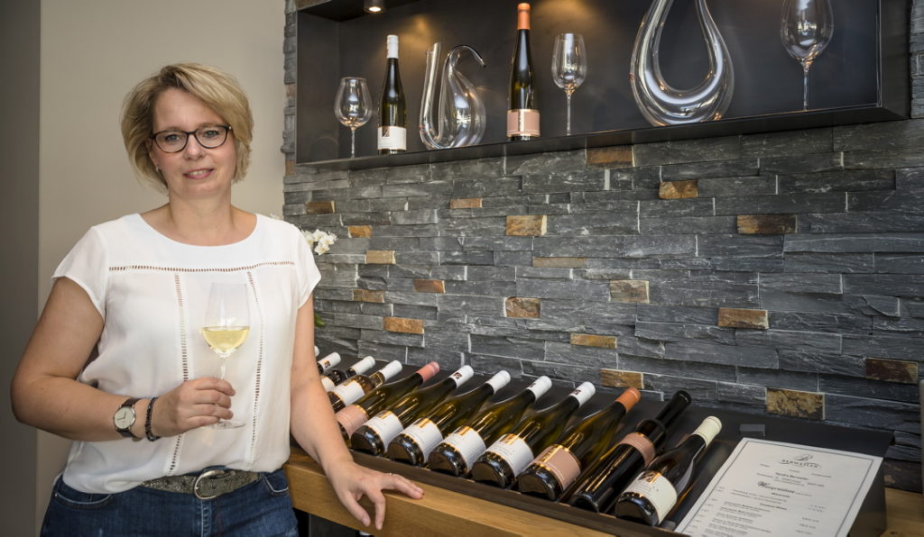 Im Weinkeller lässt sie sich von ihrem Geschmack und ihrem Bauchgefühl leiten. „Wichtig war mir von Anfang an die Spontanvergärung, also mit natürlichen Hefen zu arbeiten. Das dauert manchmal bis in den April hinein. Damit erhalte ich aber eine große Aromenvielfalt und eine sehr schöne Gärungskohlensäure im Wein. Somit arbeite ich auch viel besser den einzelnen Charakter unterschiedlicher Lagen heraus. Wir haben den grauen Schiefer in Pölich, den blauen Schiefer in Neumagen und den roten Schiefer in Schweich. Da wir als wichtigste Rebsorte den Riesling an der Mosel haben, können wir zeigen, dass diese Rebe in unterschiedlichen Lagen sehr facettenreich und unterschiedlich schmecken kann.“